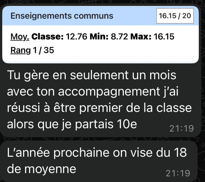➡️ Cet accompagnement permet de devenir très fort dans TOUTES les matières, pas seulement dans une seule matière comme le ferait un professeur particulier. Ici, les meilleurs étudiants de chaque matière sont là pour t’aider !